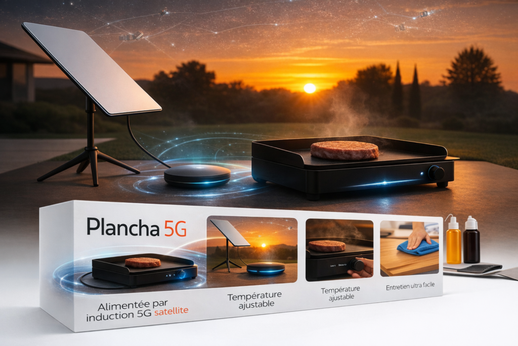 L’image de la Plancha 5G en action, avec un steak juteux dégageant une vapeur appétissante et un feu de camp en arrière-plan, a captivé les spectateurs. Alimentée par induction 5G satellite, la plancha 5G est le compagnon idéal pour les pique-niques, les apéritifs, les barbecues entre amis, ou les soirées dans le jardin tout seul comme un sale connard de boomer de merde qui se branle sur ses outils technologiques de merde. Elle est équipée d’un système de nettoyage automatique, facilitant son entretien.